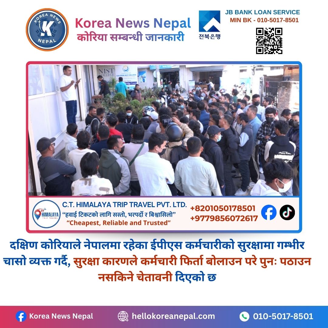 काठमाडौँ — दक्षिण कोरियाले नेपालमा रहेका रोजगार अनुमति प्रणाली(ईपीएस) अन्तर्गत श्रमिक पठाउन सहजीकरण गर्ने मानव संशाधन विभाग (एचआरडी) कर्मचारीको सुरक्षाप्रति गम्भीर चासो व्यक्त गरेको छ । उसले सुरक्षाकै कारण आफ्ना कर्मचारी फिर्ता बोलाउन परे पुन: एचआरडीमा कर्मचारी पठाउन सम्भव नरहेको समेत नेपाल सरकारको ध्यानाकर्षण गराएको छ ।