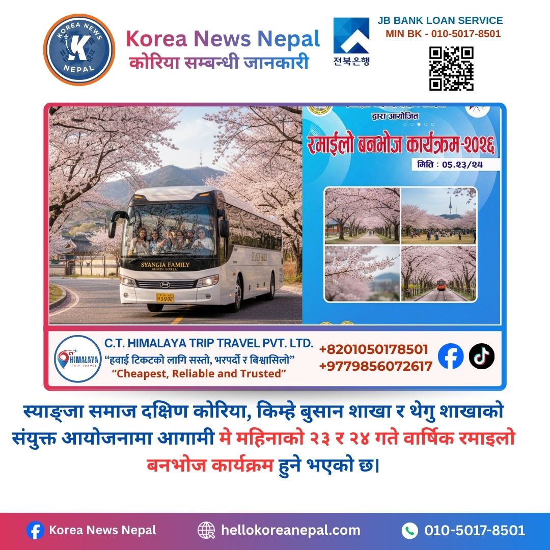 सोल, दक्षिण कोरिया – स्याङ्जा समाज दक्षिण कोरिया, किम्हे बुसान शाखा र थेगु शाखाको संयुक्त आयोजनामा आगामी मे महिनाको २३ र २४ गते वार्षिक रमाइलो बनभोज कार्यक्रम हुने भएको छ। संस्थाले प्रत्येक वर्ष आयोजना गर्दै आएको यो कार्यक्रममा यस पटक पनि व्यापक सहभागिताको अपेक्षा गरिएको छ।